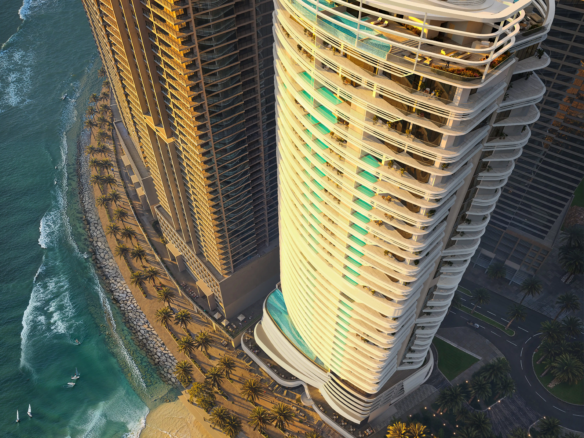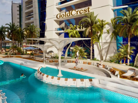 Goldcrest Bay Sands, where luxury meets elegance. As you approach the resort, you are greeted by an attractive roundabout adorned with lush tropical foliage.
